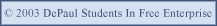 What is SIFE @ DePaul? DePaul University derives its title and fundamental mission from Saint Vincent de Paul. "I will show you the way of wisdom" ("Viam sapientiae monstrabo tibi," Proverbs, IV, 11) is the motto. SIFE team at DePaul strives to live up to this motto with its various projects and events. SIFE will provide an uplifting environment for you to take initiative, learn from other students, and gain valuable work experience. By contributing and working together with others on projects, you will be building a personal portfolio that will distinguish yourself in the job market. You will also be building friendships and relationships that will help you later on in your life. We hope that you will use SIFE as another tool for you to jumpstart your career. |